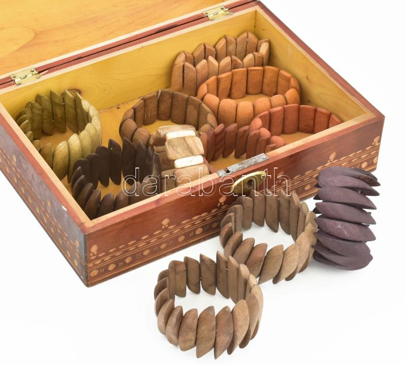 Beschreibung: Faragott fa ládika, benne 10 db fa karkötő. Doboz mérete 26x15x8 cm