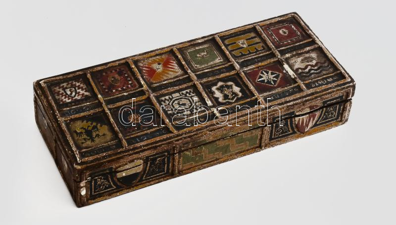 Beschreibung: Festett, faragott címeres fadoboz, kopott, kis sérülésekkel,