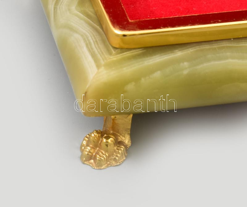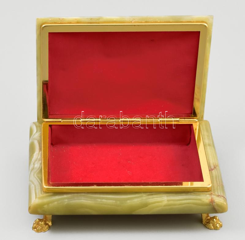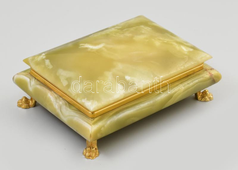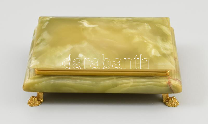 Ónix doboz, fém szerelékkel, szép állapotban, 4 lábon áll, 17x13x6 cm https://www.darabanth.com/de/444-Fernauktion/444.0/Kunst-Dokumente-andere-Sammelgebiete/Flohmarkt~500016/Onix-doboz-fem-szerelekkel-szep-allapotban-4-labon-all-17x13x6-cm~II2912073