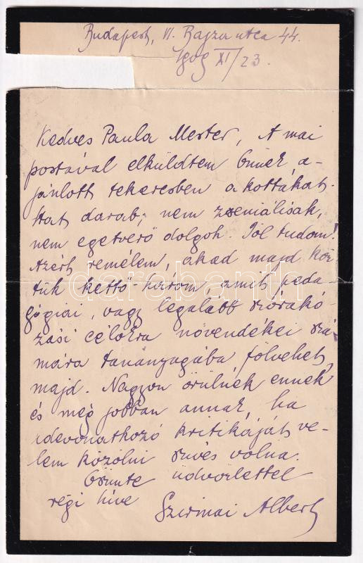 Beschreibung: 1909 Szirmai Albert (1880-1967) zeneszerző, karmester autográf levele, aláírással, megküldött kották ügyében, a tetején hiánnyal, 1 beírt oldal.