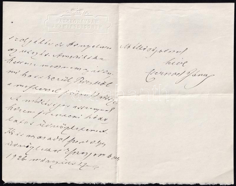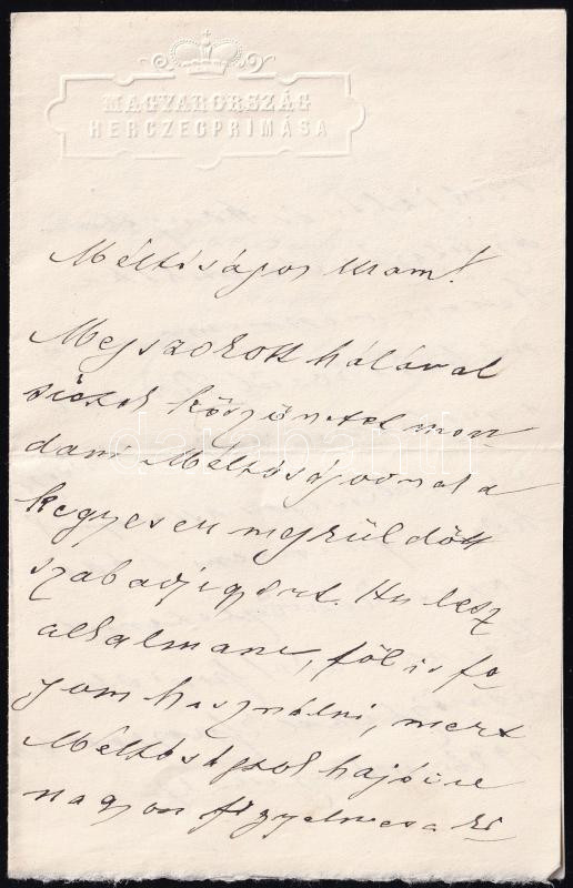 1926 Csernoch János (1852-1927) esztergomi érsek, hercegprímás, bíboros autográf köszönetnyilvánító sorai, aláírással, hercegprímási fejléces papíron, 2 és 1/4 beírt oldal.