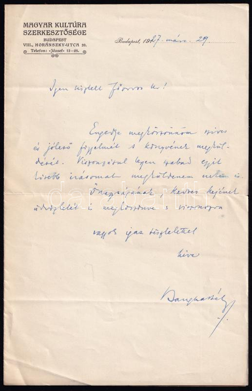 Beschreibung: 1927 Bangha Béla (1880-1940) teológus, író, jezsuita szerzetes autográf köszönő levele, aláírással, Magyar Kultúra folyóirat fejléces papírján.