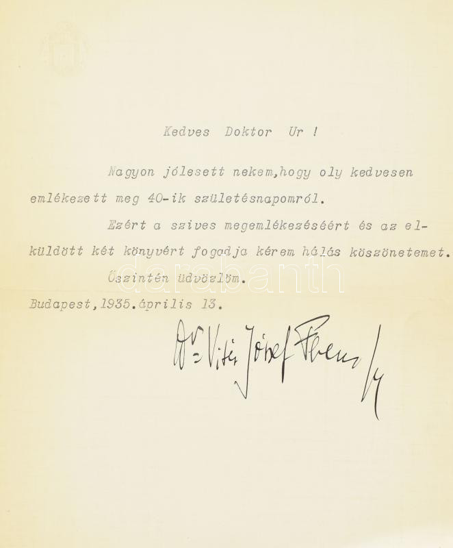1935 Habsburg-Lotaringiai József Ferenc főherceg (1895-1957) gépelt köszönő sorai, 40. születésnapi köszöntése alkalmából, címeres papíron, autográf aláírásával, Völgyesi Ferenc (1895-1967) orvos, pszichiáter és hipnotizőr részére.