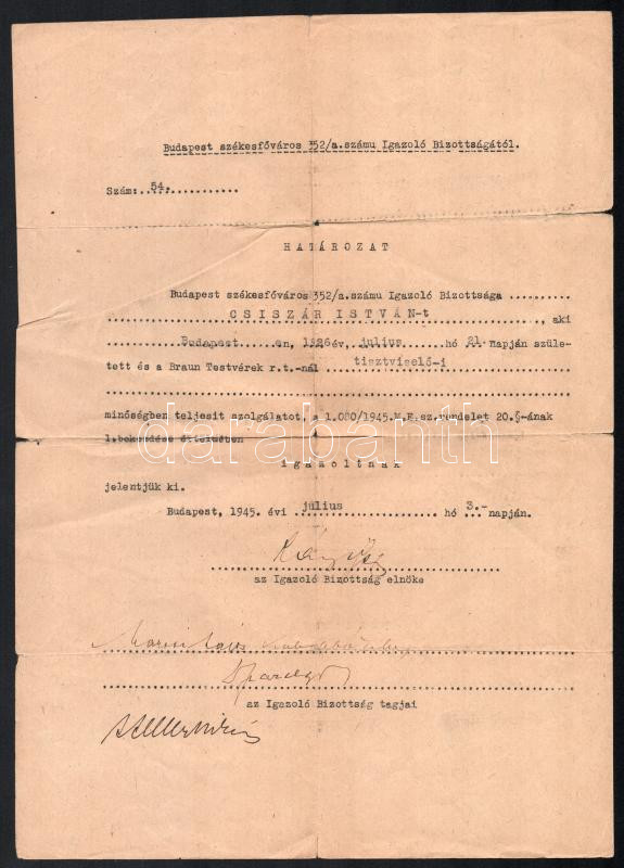 1945 Bp., igazolóbizottsági határozat a Braun Testvérek Rt. tisztvisel... https://www.darabanth.com/de/444-Fernauktion/444.0/Kunst-Dokumente-andere-Sammelgebiete/Historische-Dokumenten-Handschriften~500023/1945-Bp-igazolobizottsagi-hatarozat-a-Braun-Testverek-Rt-tisztviseloje-reszere~II2926250