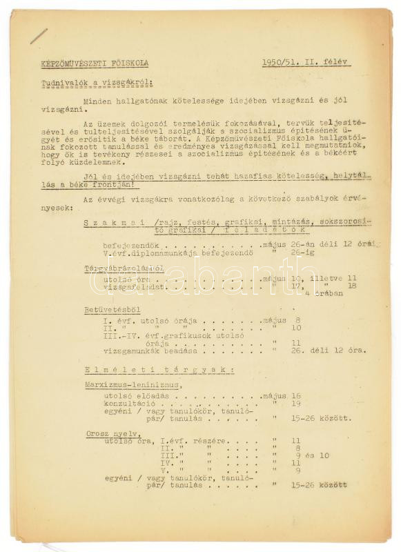 1950-1951 Bortnyik Sándor (1893-1976) festőművész , grafikus autográf aláírása a Képzőművészeti Főiskola 1950/1951. II. félévének vizsgáit tárgyaló ismertetőn, 6 p.