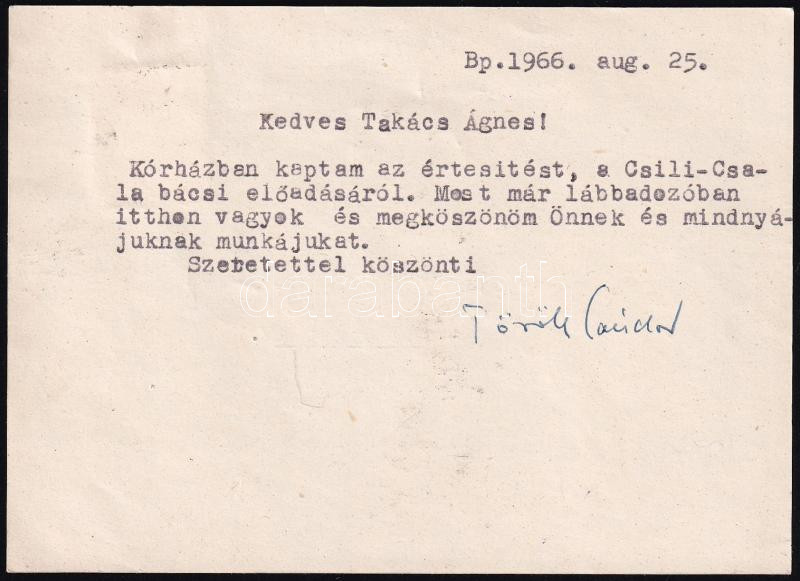 1966 Török Sándor (1904-1985) gépelt köszönő sorai üdvözlőkártyán, aut... https://www.darabanth.com/de/444-Fernauktion/444.0/Kunst-Dokumente-andere-Sammelgebiete/Historische-Dokumenten-Handschriften~500023/1966-Torok-Sandor-1904-1985-gepelt-koszono-sorai-udvozlokartyan-autograf-alairass~II2933311