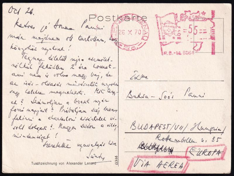 1970 Lénárd Sándor (1910-1972) orvos, művelődéstörténész, költő, író, műfordító, klasszika-filológus, gasztrotörténész autográf sorai Baksa-Soós Anna részére, aláírással.