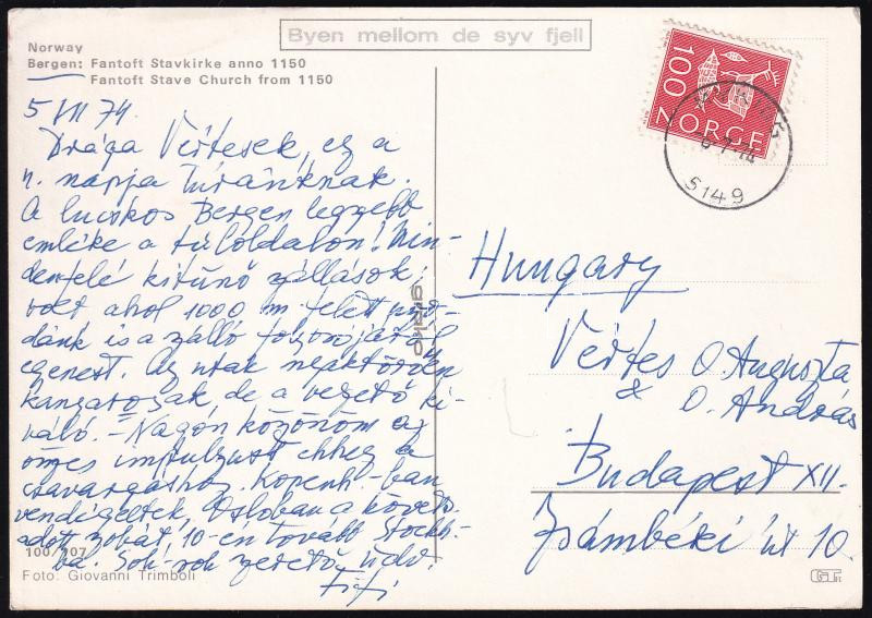 1976 Radnóti Miklósné Gyarmati Fanni (1912-2014) kézzel írt, levelezőlapja Vértes O. András (1911-1997) nyelvész részére Osloból, privát témákról Fifi aláírással