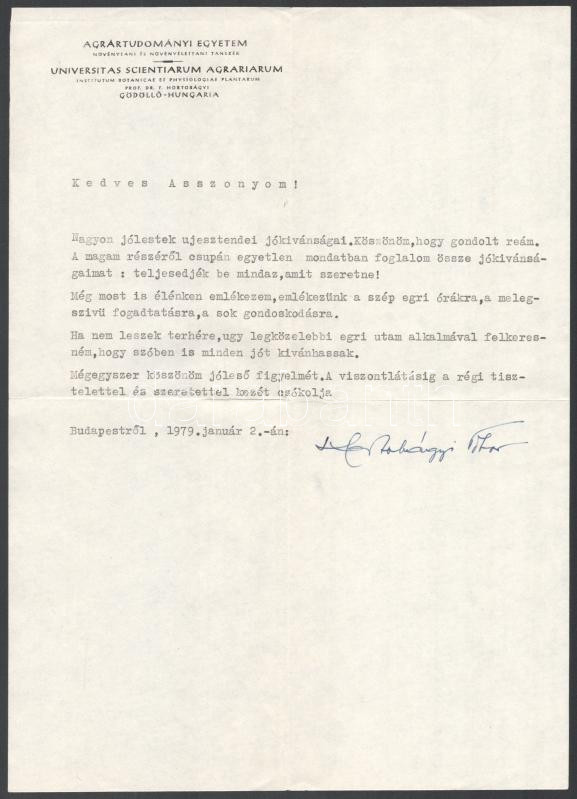 1979 Bp., Agrártudományi Egyetem Növénytani és Növényélettani Tankszék fejléces levélpapírjára írt, gépelt köszönő levél, Hortobágyi Tibor (1912-1990) mezőgazdász, egyetemi tanár autográf aláírásával