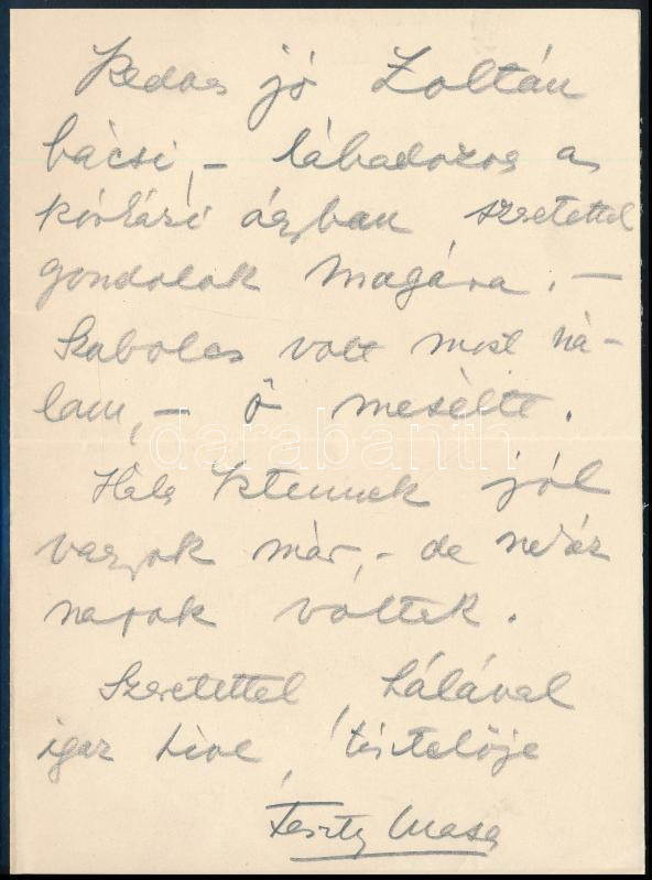Feszty Masa Mária (1895-1979) festőművész, Feszty Árpád és Jókai Róza lányának autográf levele Farkas Zoltán (1880-1969) irodalomtörténész, kritikus, művészeti író részére, évszám nélkül, autográf aláírásával, 1 beírt oldal.