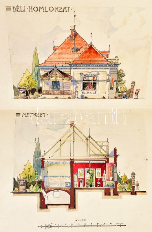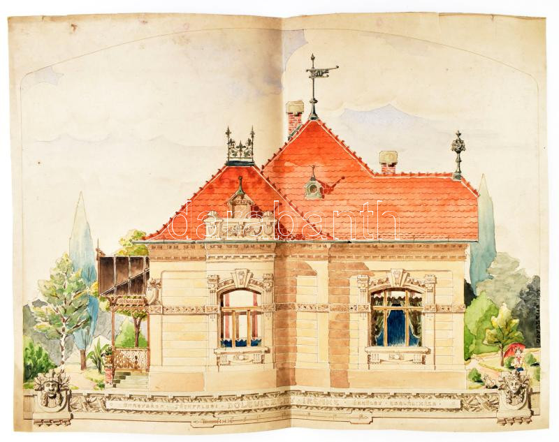 cca 1890 Dunakeszi? Tóthfalusi Doleviczény Irén úrhölgy nyaralójának komplett látványtervei, 6 db látványterv 4 táblán Oszvaldik Gyula (1884-?) műépítész tervei Táblák mérete 40x32 cm