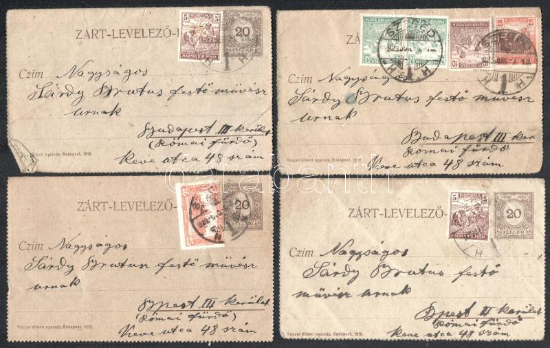 cca 1922-23 4 db Sárdy Brutus (1892-1970) festőművész, restaurátor részére küldött zárt levelezőlap, mind az édesanyjától