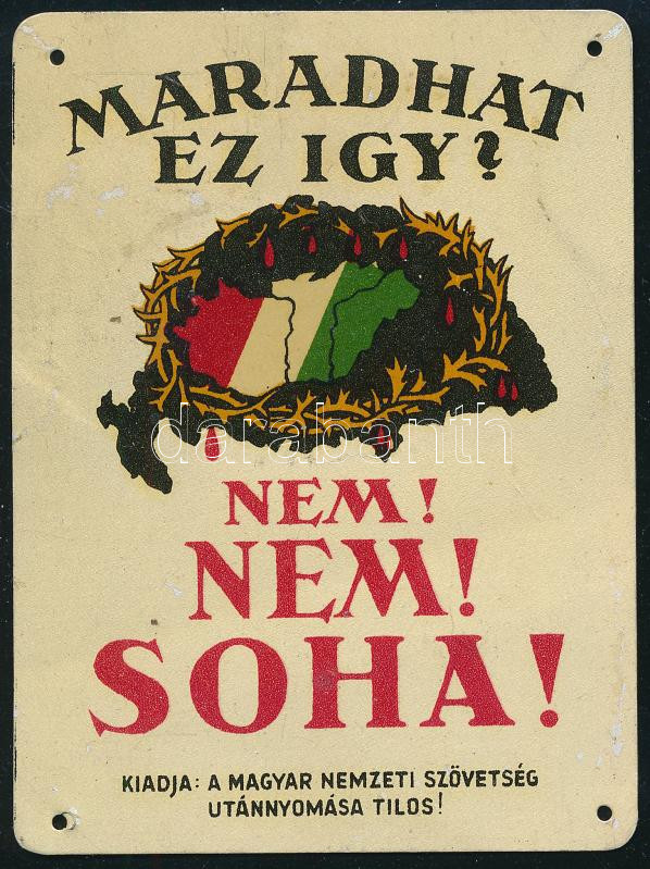 Beschreibung: cca 1925 "Maradhat ez így? Nem, nem, soha!", kiadja a Magyar Nemzeti Szövetség, irredenta fém tábla, 8x6 cm