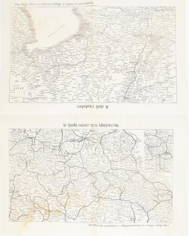 1866 "Az éjszaki csatatér egész kiterjedésében/A déli csatatér" térképe, Rendkívüli melléklet a "Magyarország és a nagy világhoz"-hoz, Porosz-osztrák-olasz háború térképe, hajtott, foltos, 29x45 cmx2