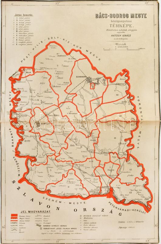 Beschreibung: 1880 Bács-Bodrog megye közigazgatási térképe. Hátsek Ignác, 1:500 000, kis lapszéli szakadásokkal, 47×30 cm