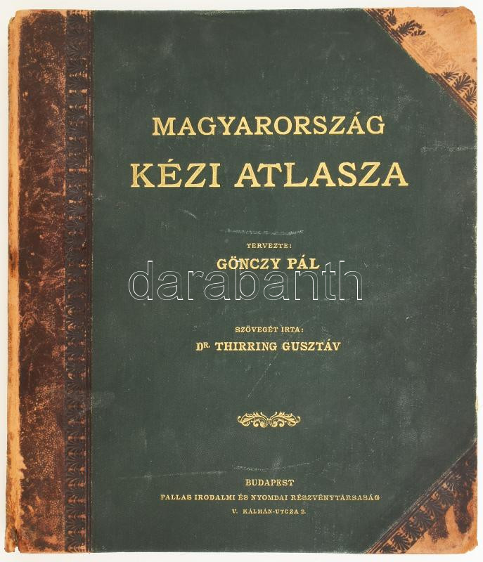 1897 Magyarország kézi atlasza. 75 térkép. Tervezte: Gönczy Pál. Szövegét írta: Dr. Thirring Gusztáv. Bp., [1897], Pallas, 21 p. + 75 t. Kiadói aranyozott félbőr-kötésben, kissé sérült, kopottas borítóval és gerinccel, helyenként kissé foltos lapokkal, ceruzás és tollas bejegyzésekkel.