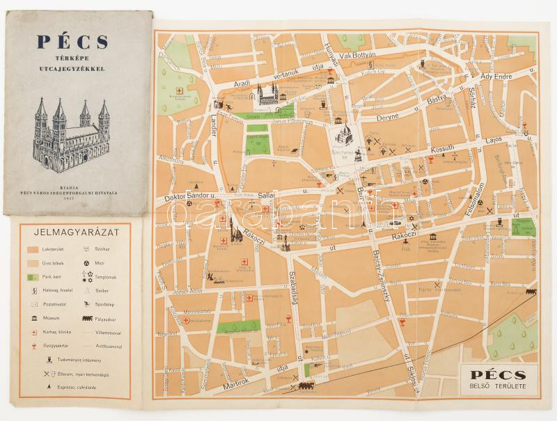 1957 Pécs térképe utcajegyzékkel + 1968 Budapest távlati térképe, belső terület. A műemlékek, emlékművek és kulturális intézmények feltüntetésével. Tervezte: Mácsai István - Kass János. Bp., Képzőművészeti Alap-Kartográfiai Vállalat, kis sérülésekkel,117x82 cm