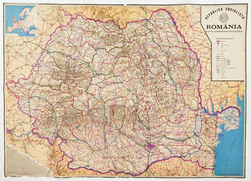 1988 Románia közigazgatási és úthálózati térképe. / Republica Socialista Romania, Harta administrativ-rutiera. Bucuresti, Editura Stiintifica si Enciclopedica. Kissé sérült lapszélekkel. / Slightly damaged edges. 91x65 cm
