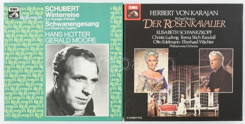 Beschreibung: Karajan Strauss a Rózsalovag c operettének két kazettás díszkiadása szövegkönyvvel NM + Schubert Winterreise, Schwanengesang dupla kazettás kiadás NM
