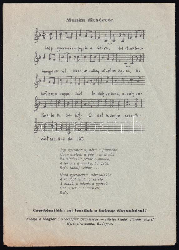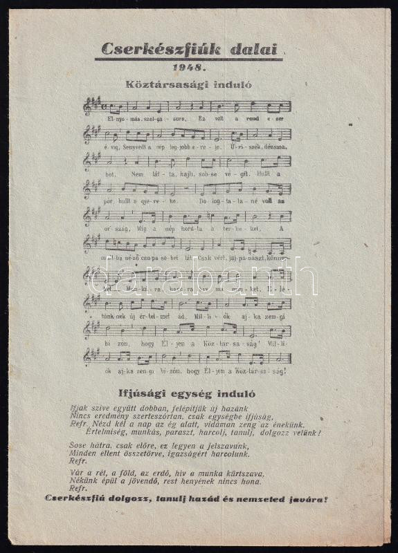Beschreibung: 1948 Cserkészfiúk dalai, népi demokratikus propaganda dalok, kétlapos nyomtatvány, kiadja a Cserkészfiúk Szövetsége, szép állapotban