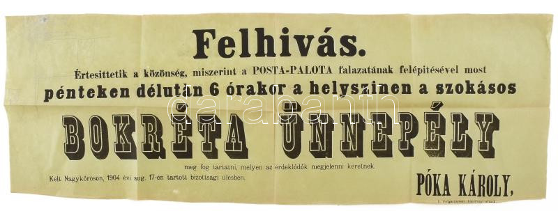 1904 Nagykőrös a Posta palota bokrétaünnepségének plakátja 63x22 cm https://www.darabanth.com/de/444-Fernauktion/444.0/Kunst-Dokumente-andere-Sammelgebiete/Plakat~1500008/1904-Nagykoros-a-Posta-palota-bokretaunnepsegenek-plakatja-63x22-cm~II2933883