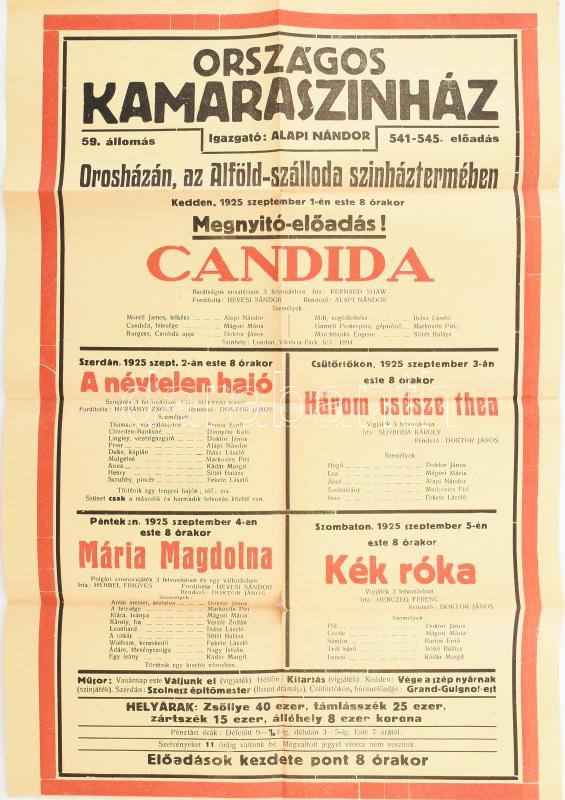 1925 Orosháza Országos Kamaraszínház megnyitó előadás színházi plakát ... https://www.darabanth.com/de/444-Fernauktion/444.0/Kunst-Dokumente-andere-Sammelgebiete/Plakat~1500008/1925-Oroshaza-Orszagos-Kamaraszinhaz-megnyito-eloadas-szinhazi-plakat-31x43-cm-Hajtva~II2925336