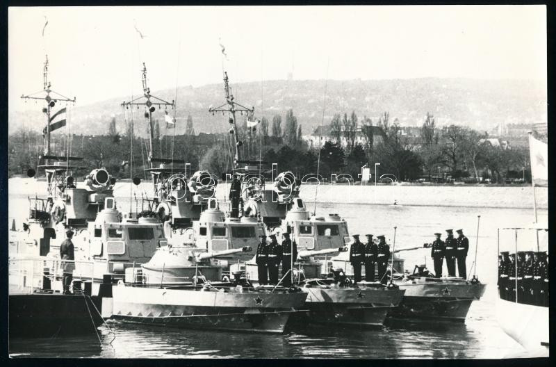 Beschreibung: cca 1970-1980 A Szovjet Dunai Flottilla naszádjai Budapesten, nagyméretű fotó, későbbi előhívás, 23x15 cm