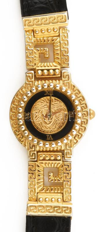 Beschreibung: Gianni Versace design női karóra, aranyozott, sorszámozott tokkal, bőr szíjjal, nincs kipróbálva, d: 24 mm