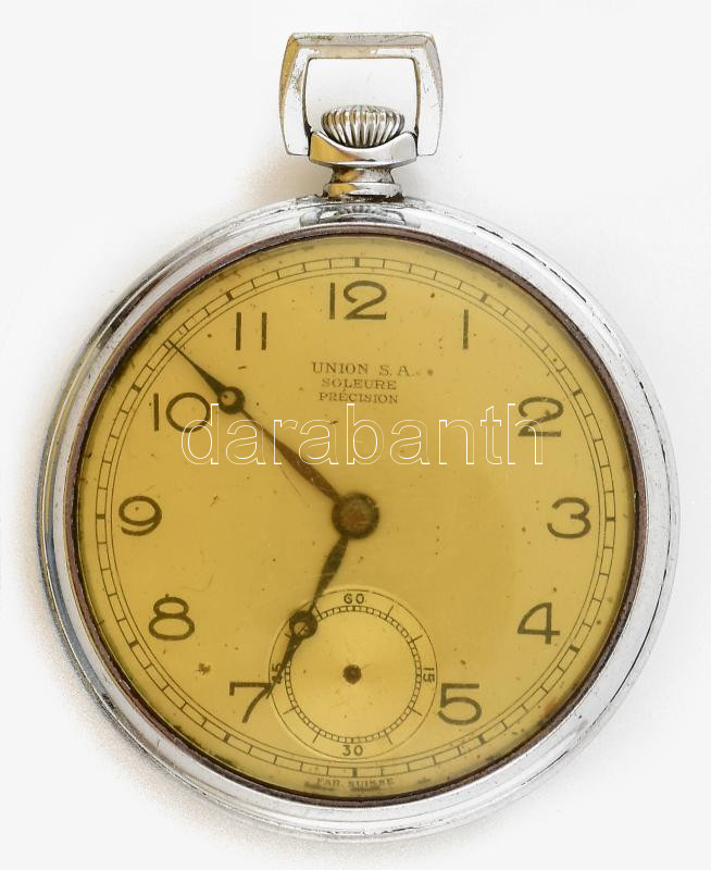 Union S.A. Soleure Précision svájci zsebóra, hiányzó másodpercmutatóva... https://www.darabanth.com/de/444-Fernauktion/444.0/Kunst-Dokumente-andere-Sammelgebiete/Uhren~500013/Union-SA-Soleure-Precision-svajci-zsebora-hianyzo-masodpercmutatoval-nem-mukodik-d-47~II2925877