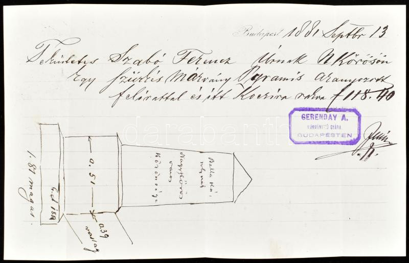 Beschreibung: 1881 Gerenday síremlék dekoratív fejléces számla síremlék rajzával