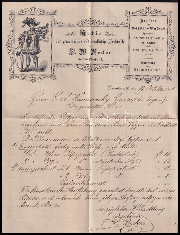 1891 Drezda, Archiv für genealogisch-heraldische Auskünfte und Atelier... https://www.darabanth.com/de/444-Fernauktion/444.0/Kunst-Dokumente-andere-Sammelgebiete/Werbungen~500028/1891-Drezda-Archiv-fur-genealogisch-heraldische-Auskunfte-und-Atelier-fur-Wappen-Malerei-reklam~II2881697