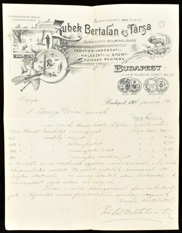 1908 Zubek Bertalan és társa vadászati és halászati cikkek dekoratív f... https://www.darabanth.com/de/444-Fernauktion/444.0/Kunst-Dokumente-andere-Sammelgebiete/Werbungen~500028/1908-Zubek-Bertalan-es-tarsa-vadaszati-es-halaszati-cikkek-dekorativ-fejleces-szamla~II2933978