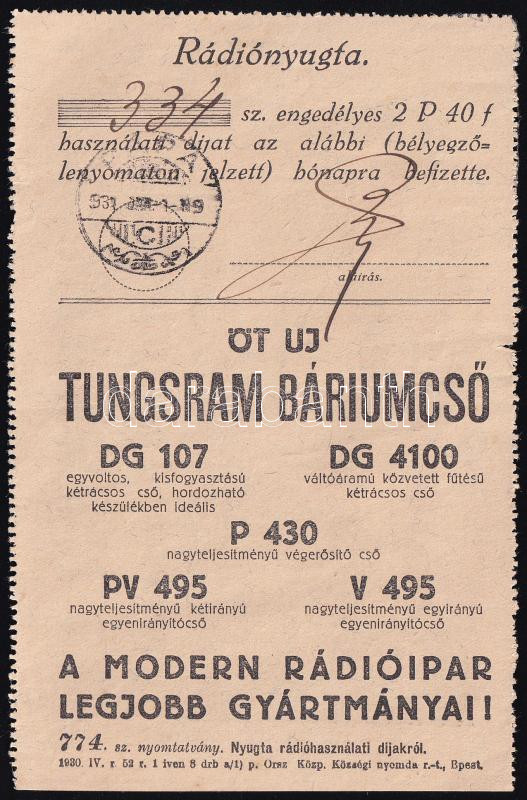 Beschreibung: 1930 Tungsram Standardyne Európavevő rádiónyugta, art deco grafikával