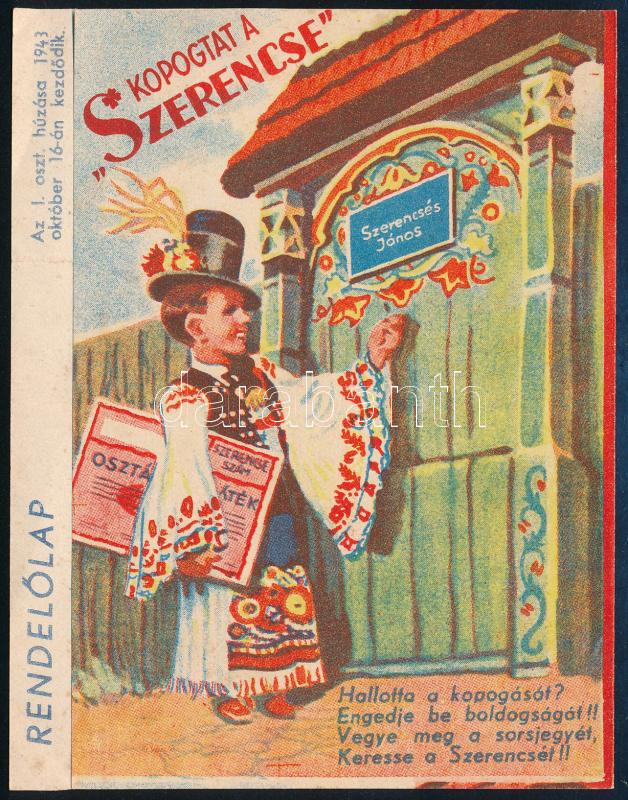 1943 "Kopogtat a szerencse", M. kir. Osztálysorsjáték, illus... https://www.darabanth.com/de/444-Fernauktion/444.0/Kunst-Dokumente-andere-Sammelgebiete/Werbungen~500028/1943-Kopogtat-a-szerencse-M-kir-Osztalysorsjatek-illusztralt-reklam-es-rendelolap~II2926234