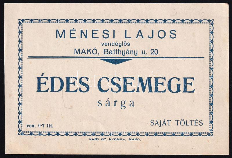Ménesi Lajos Makó, Édes csemege sárga borcímke https://www.darabanth.com/de/444-Fernauktion/444.0/Kunst-Dokumente-andere-Sammelgebiete/Werbungen~500028/Menesi-Lajos-Mako-Edes-csemege-sarga-borcimke~II2898906