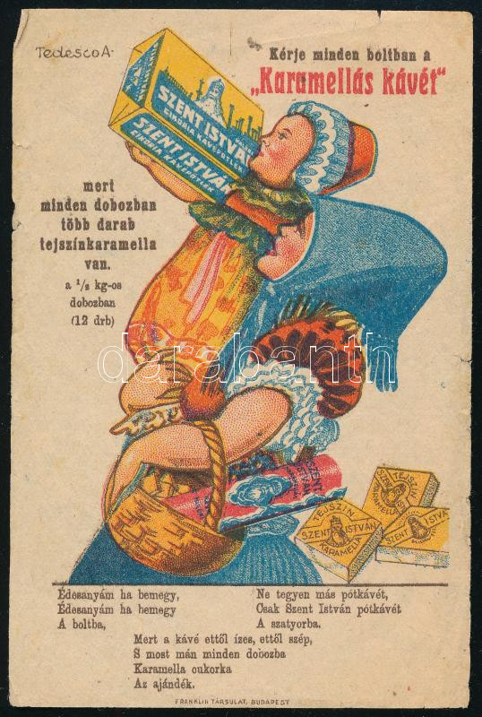 Szent István karamellás kávé számolócédula https://www.darabanth.com/de/444-Fernauktion/444.0/Kunst-Dokumente-andere-Sammelgebiete/Werbungen~500028/Szent-Istvan-karamellas-kave-szamolocedula~II2933531