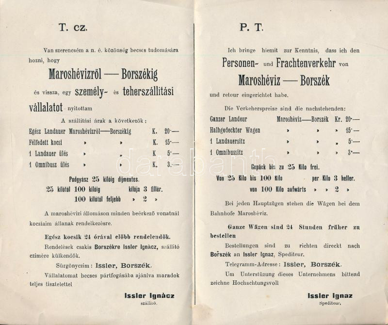 Beschreibung: cca 1900-1910 Issler Ignác Maroshévíz-Borszék (Erdély) személy- és teherszállítási vállalat kétnyelvű reklámlapja, középen hajtott, jó állapotban