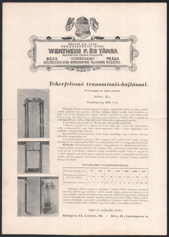 Beschreibung: cca 1900-1910 Wertheim F. és Társa m. kir. udvari szállítók teherfelvonó ismertető / reklám, középen hajtott, 38x27 cm
