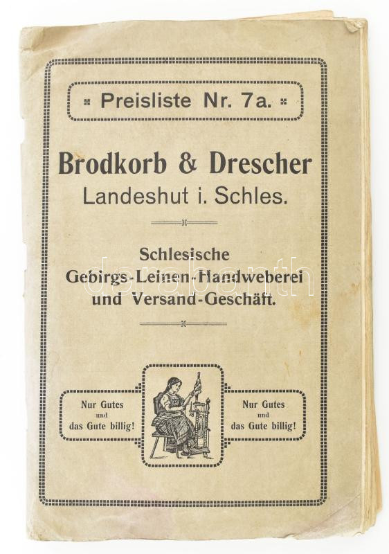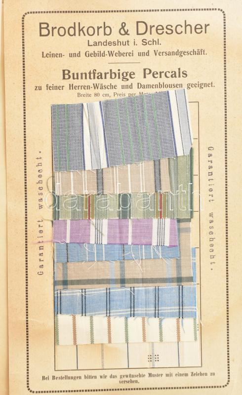 cca 1910-1920 Brodkorb & Drescher Schlesische Gebirgs-Leinen-Handweberei und Versand-Geschäft. Preisliste Nr. 7 a. Kézi szövésű vászonanyagok mintakatalógusa és árjegyzéke, rengeteg termékmintával, német nyelven. Tűzött papírkötés, 84 p. + Benne további mintaanyagok