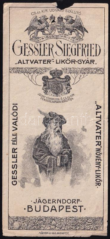 cca 1910 Gessler Siegfried ,,Altvater"-Likőrgyár számolócédula, k... https://www.darabanth.com/de/444-Fernauktion/444.0/Kunst-Dokumente-andere-Sammelgebiete/Werbungen~500028/cca-1910-Gessler-Siegfried-Altvater-Likorgyar-szamolocedula-kisse-serult~II2926923