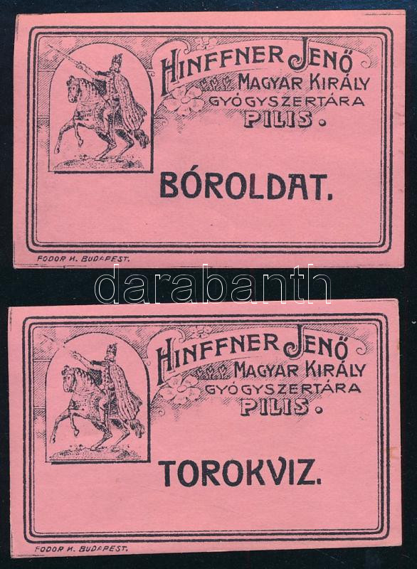 cca 1910 Pilis, Hinffner Jenő Magyar Király Gyógyszertára 2 db címkéje... https://www.darabanth.com/de/444-Fernauktion/444.0/Kunst-Dokumente-andere-Sammelgebiete/Werbungen~500028/cca-1910-Pilis-Hinffner-Jeno-Magyar-Kiraly-Gyogyszertara-2-db-cimkeje-Torokviz-Boroldat-~II2930430