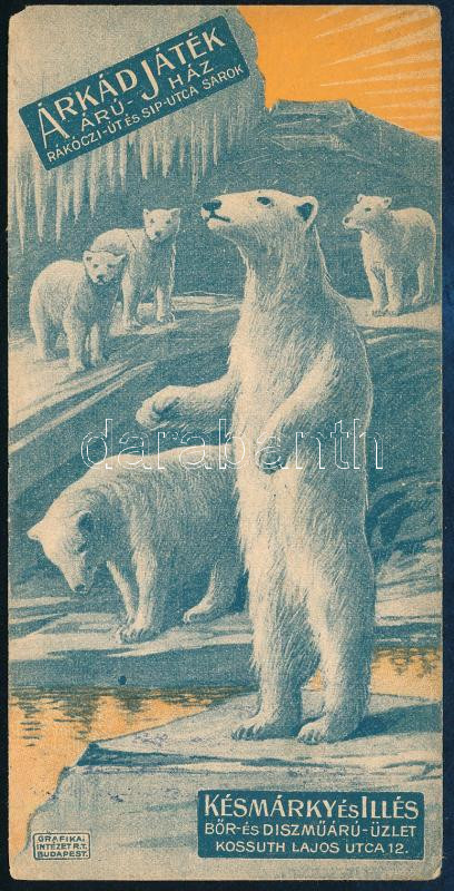 cca 1910 Régi számolócédula, Árkád Játékáruház, Rákóczi út és Síp utca sarok - Késmárky és Illés bőr- és díszműáru-üzlet, Kossuth Lajos u. 12. Bp., Grafikai Intézet Rt., 14×7 cm
