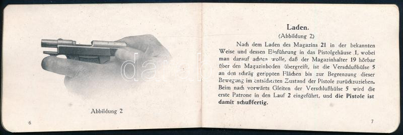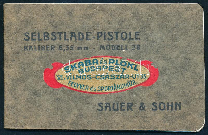 cca 1920 Sauer &Sohn öntöltő pisztoly Skaba és Plökls fegyver és sportáruház címkével ellátott képes kezelési utasítása 32 p. képekkel, + 1 kih tábla 11x6,5 cm