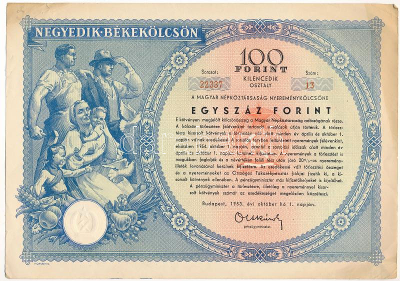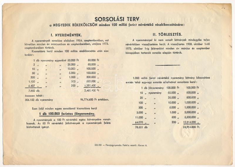 Budapest 1953. "Negyedik Békekölcsön" nyereménykölcsön 100Ft... https://www.darabanth.com/de/444-Fernauktion/444.0/Numismatik/Aktien-und-Tickets~1000005/Budapest-1953-Negyedik-Bekekolcson-nyeremenykolcson-100Ft-rol-szarazpecsettel-13-2233~II2801966