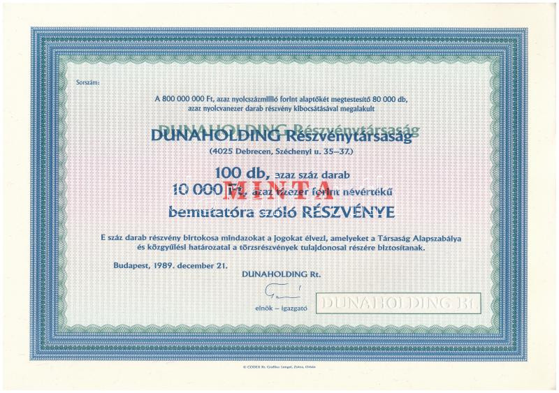 Budapest 1989. "Dunaholding Részvénytársaság" 100db bemutató... https://www.darabanth.com/de/444-Fernauktion/444.0/Numismatik/Aktien-und-Tickets~1000005/Budapest-1989-Dunaholding-Reszvenytarsasag-100db-bemutatora-szolo-reszvenye-10000Ft-ne~II2927453
