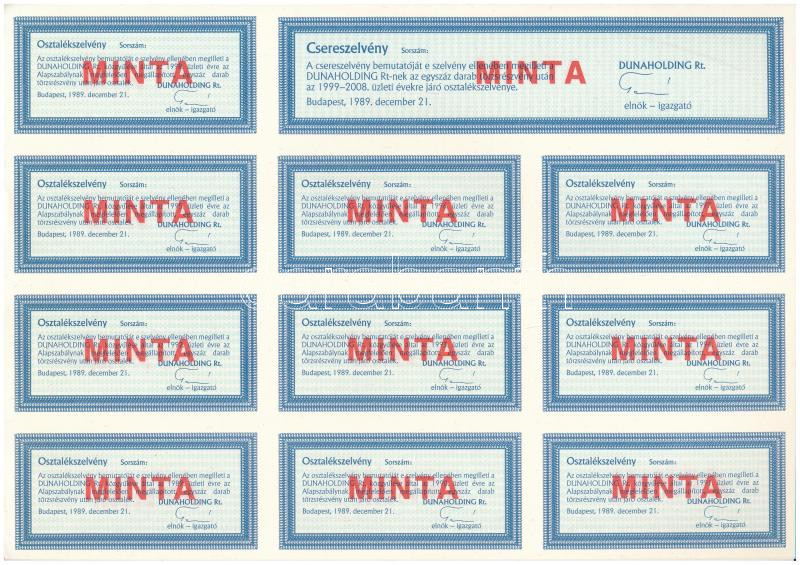Beschreibung: Budapest 1989. "Dunaholding Részvénytársaság" 100db bemutatóra szóló részvénye 10.000Ft névértékben, "MINTA" felülbélyegzéssel, szárazpecséttel, szelvényekkel T:UNC,AU