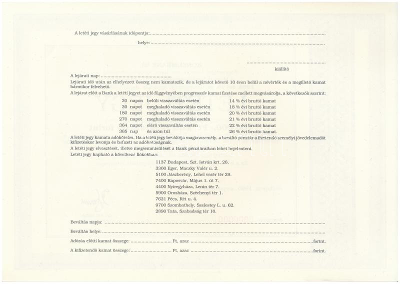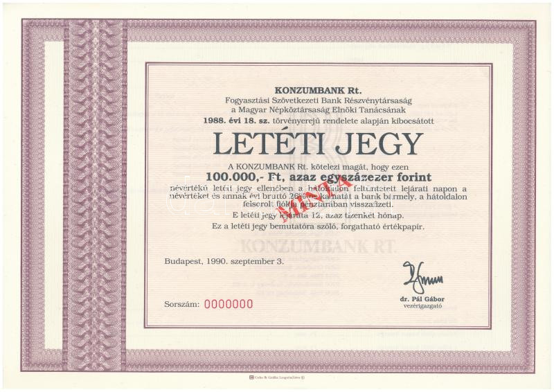 Beschreibung: Budapest 1990. "Konzumbank Rt" letéti jegye 100.000Ft névértékben, "MINTA" felülbélyegzéssel, "0000000" sorszámmal T:UNC