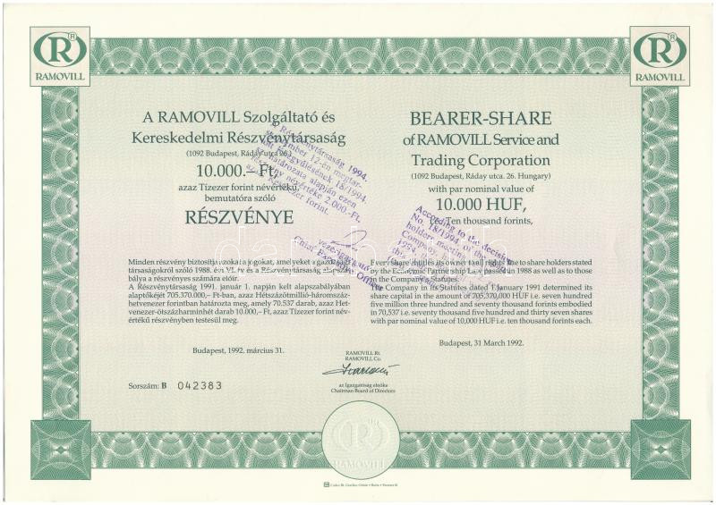 Budapest 1992. "Ramovill Szolgáltató és Kereskedelmi Részvénytárs... https://www.darabanth.com/de/444-Fernauktion/444.0/Numismatik/Aktien-und-Tickets~1000005/Budapest-1992-Ramovill-Szolgaltato-es-Kereskedelmi-Reszvenytarsasag-reszvenye-10000Ft-r~II2871920