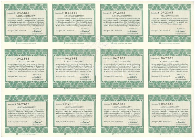 Beschreibung: Budapest 1992. "Ramovill Szolgáltató és Kereskedelmi Részvénytársaság" részvénye 10.000Ft-ról szelvényekkel, szárazpecséttel, bélyegzéssel T:UNC,AU