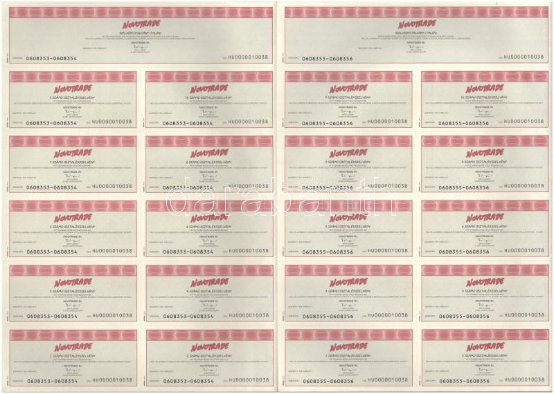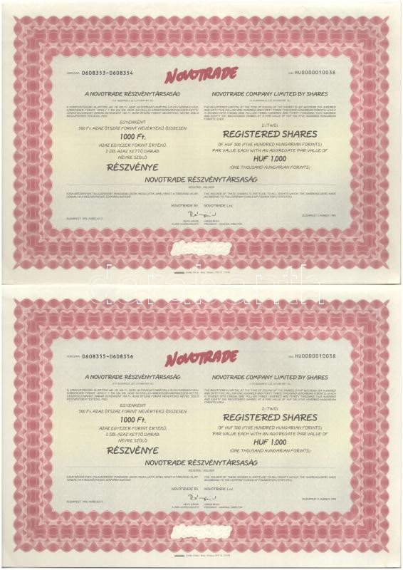 Budapest 1998. "Novotrade Részvénytársaság" 2db névre szóló, magyar és angol nyelvű részvénye összesen 1000Ft értékben (2x) sorszámkövetők, szárazpecséttel, szelvényekkel T:AU